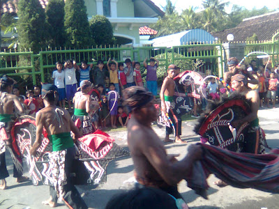 Karena pentas di rumah tak punya halaman luas, maka jalan rayapun digunakan sebagai panggung pentas jaranan